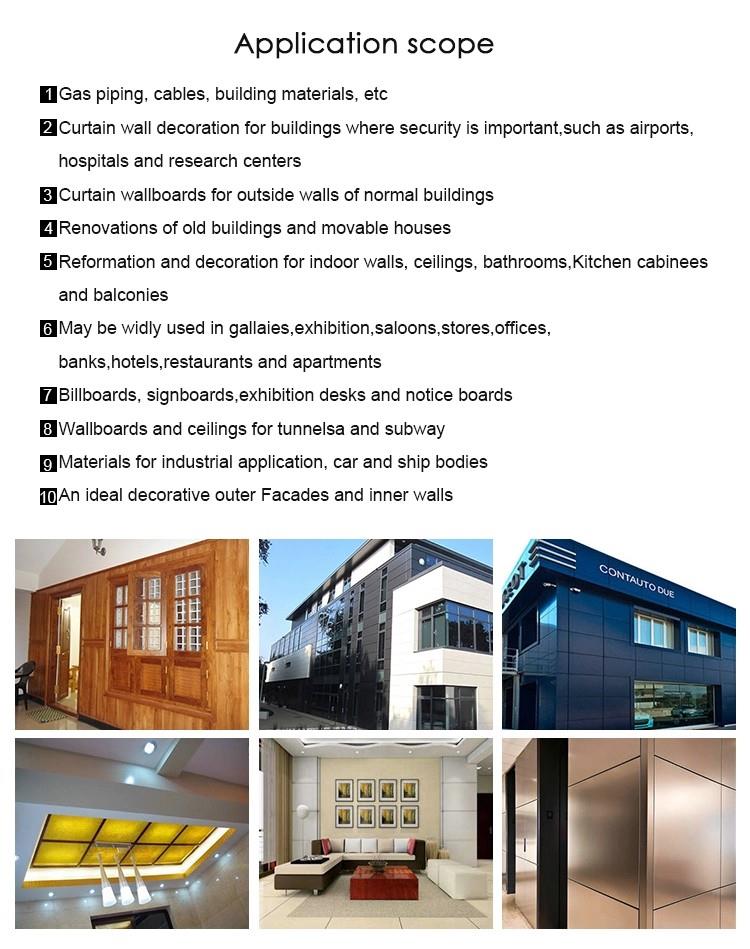 Méret: 4x8 láb, egyedi méret Származási hely: Hunan, Kína Márkanév: HUABOND Modellszám: HTB Használata: Kültéri Funkció: antisztatikus, antibakteriális, tűzálló, penészálló | Felületkezelés: eloxált, szálcsiszolt, fólia díszítés, tükör, PE bevonat, nyomtatás, PVDF bevonat Bevonat: PE Tanúsítvány: CE/SGS/ISO9001 Szállítási idő: 18-22nap |
